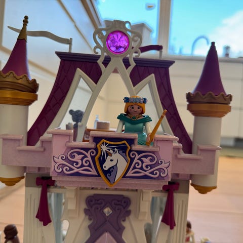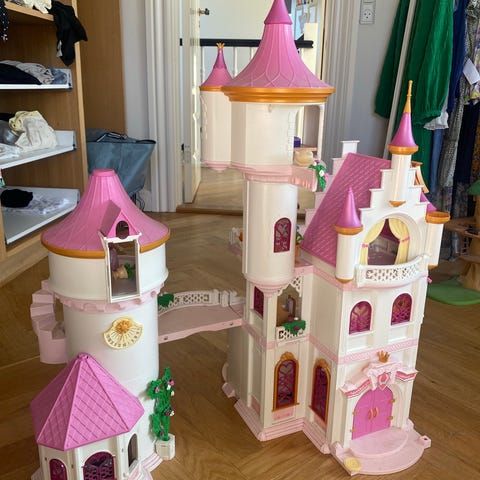 Playmobil Slot legetøj med tilbehør inklusive figurer, møbler, tøj og rekvisitter. Sættet indeholder et slot med tårne, bord, stole, tøjstativ og diverse småting. Slottet kan klappes sammen og låses af.