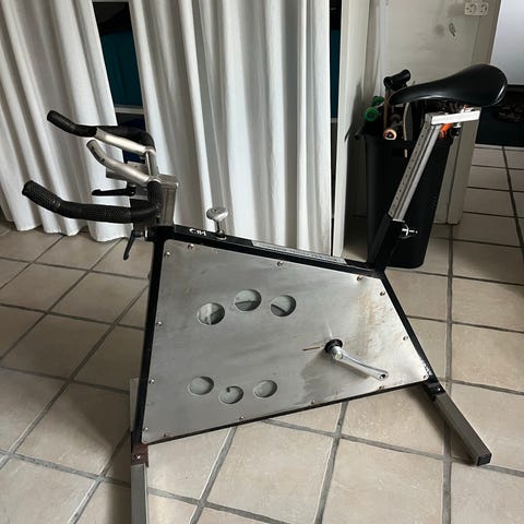 Indendørs cykel træningscykel med sort og sølv farvet stel. Designet til stationær brug med justerbart sæde og styr. Velegnet til træning i hjemmet.