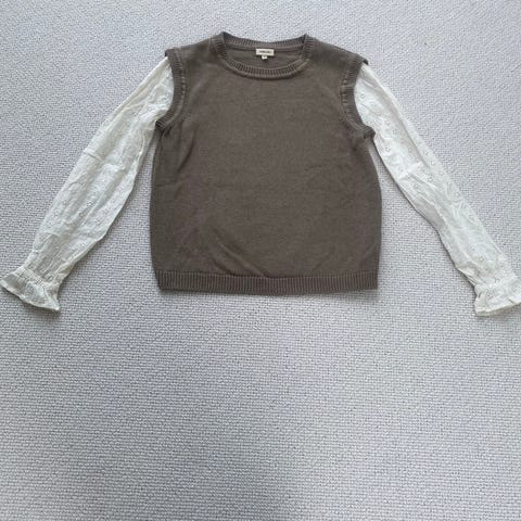 Den har lange ærmer og en dekorativ flæsekant ved skuldrene.