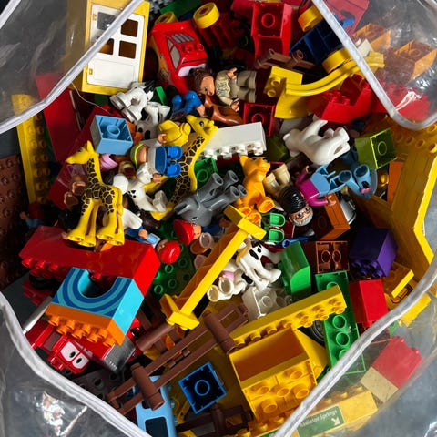 Sælger en stor IKEA-pose fyldt med blandede DUPLO klodser – perfekt til kreativ leg for de små. Indeholder hjul, tagdele, vinduer og masser af farverige byggeklodser.