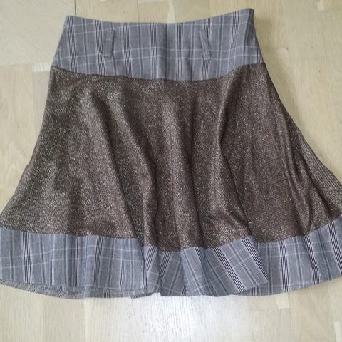 Nederdel, str 38, længde 71 cm, taljemål 80 cm, med foer, lynlås bag. 40 % uld og 60 % polyester.