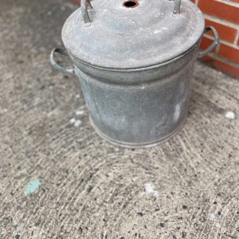 Henkogningsgryde af ældre dato. Termometeret fungerer fint, men holderen til termometeret har lidt rust. Selve henkogningsgryden er ellers i brugbar stand.
