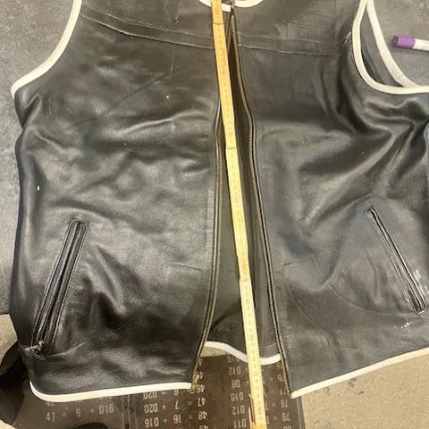 mdm lædervest i størrelse 2XL til herre. Vesten er sort og lavet af læder. Den har tre lukkemekanismer foran og to udvendige og to indvendige lommer. Vesten har glidelåsdetaljer ved siderne og er designet til at give en tæt pasform og justering så den kan bæres udenpå jakke eller under jakken.