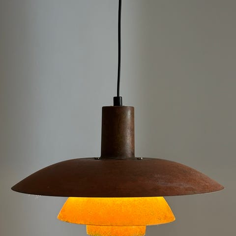 Pendellampen er udformet i runde kobberskærme med flere lag, der er hvide eller røde på undersiden. Velegnet til ophæng i stuer eller spisestuer for en jævn og behagelig lysfordeling. Klar til ophæng.