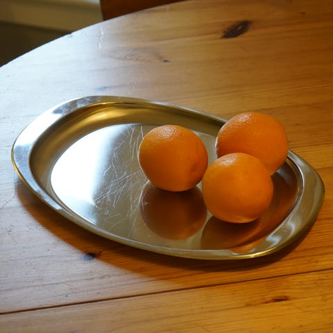 Alessi Girotondo Rund bakke i rustfrit stål med dekorative figurer langs kanten. Egnet til servering og præsentation af mad og drikkevarer samt til dekoration.