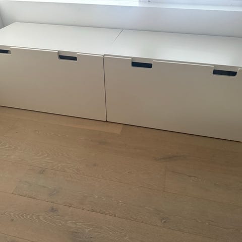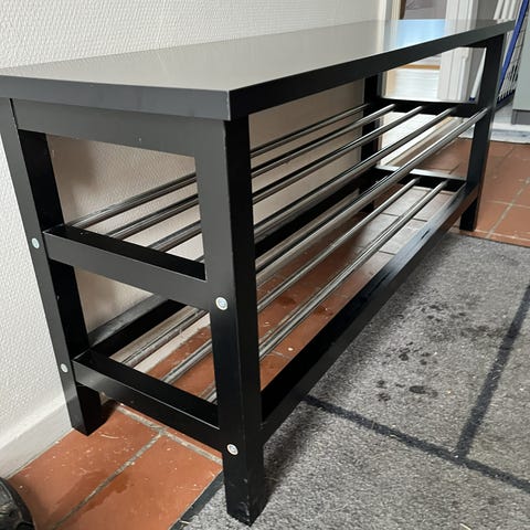 Sort bænk m. Opbevaring. 2 store dybe skuffer. En del ridser og en synlig skade i malingen (se billede). Kan evt. gøres hyggelig med en pude på toppen