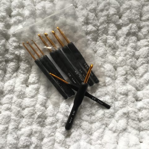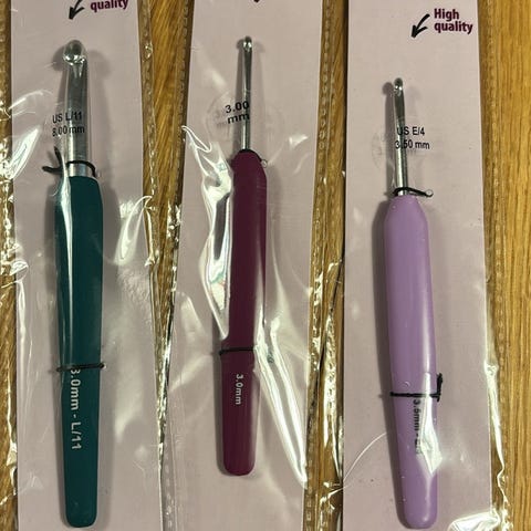 Sæt med tre hæklenåle i forskellige størrelser og farver. Materiale og specifikke mål ikke oplyst. Velegnet til hæklearbejde.