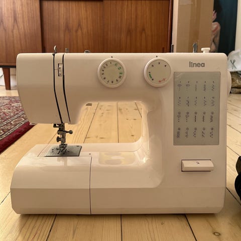 Linea symaskine i hvid farve. Maskinen har flere indstillinger til forskellige sting og er udstyret med drejeknap til valg af stingtype. Designet med bærehåndtag for nem transport. Passer til almindelig syning og reparation af tøj.Mangler pærer og pedal,syr rigtigt fint