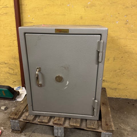 Køber henter skabet som står på en palle. Der er stabler til at løfte det op i bil eller trailer.