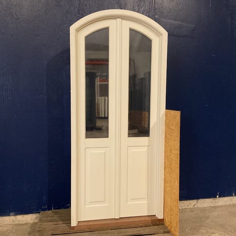 Velholdt dobbelt terrassedør - original fra Bøjsø Vinduer og Døre. 18 håndkittede ruder i hvert dørblad - med koblede ruder indvendigt. Inkl. karm samt bundstykke i hårdttræ. Indadgående med indvendigt greb.
