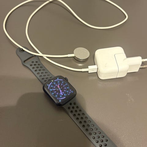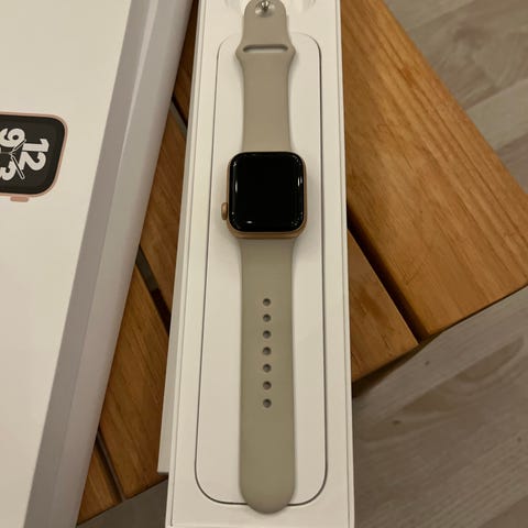 Apple Watch Andet med sort silikone rem. Uret har en firkantet skærm og justerbar rem med flere huller for tilpasning. Materialet på remmen er silikone, hvilket giver fleksibilitet og komfort. Designet er unisex og passer til forskellige håndledsstørrelser.