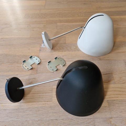 Mini Tua hængelampe med hvid og krom finish. Lampen bruger 2 x 40W E14 pærer og er designet til 230V strømforsyning.