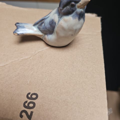 Porcelæn fuglefigur med detaljeret sort og hvid farveskala. Figuren er formet som en siddende fugl med et orange næb og glaseret finish. Velegnet som dekorationsgenstand.