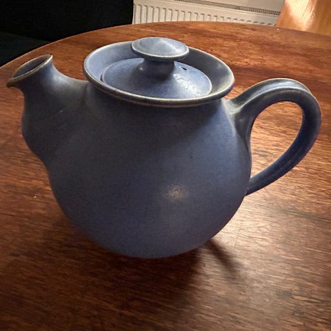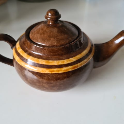 Ukendt retro keramisk tekande i brun farve med låg og håndtag. Tekanden har en rund form og en lille tud til hældning. Egnet til brygning og servering af te.