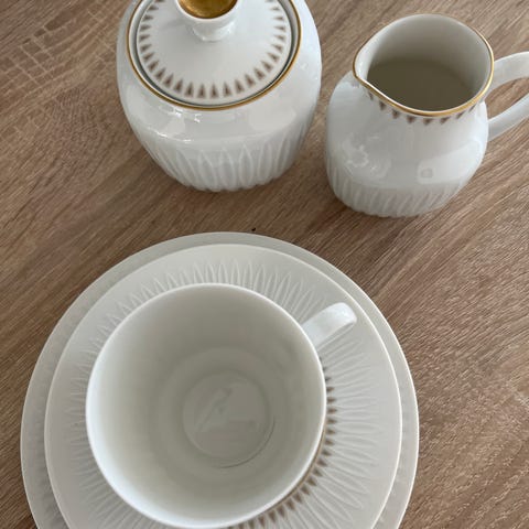 Made i France – mrk Duralex består af 15 kopper med underkopper og 10 kagetallerkener.