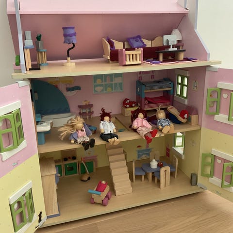 Vintage dukkehus i træ med interiør beklædt med forskellige tapeter. Dukkehuset har 8 rum fordelt på to etager og to sider. Træmaterialet og tapetet viser tegn på slid og brug over tid.