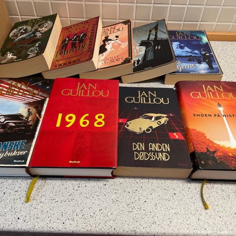 Jan Guillou bogpakke bestående af flere titler, herunder 'Den Anden Dødsynd', '1968', 'Ægte Amerikanere', 'Blå Stjerne', 'Alt Vil Se', og 'Sort'. Bøgerne er i dansk sprog og dækker forskellige emner og genrer.