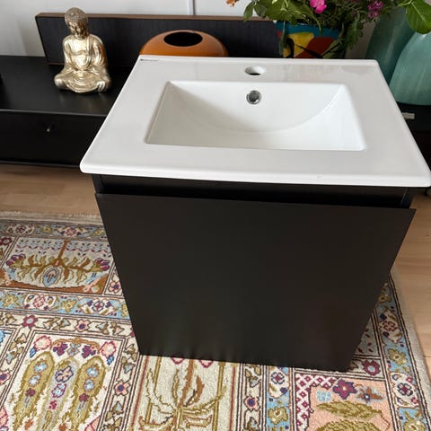 Bath delux Badeværelsesskab i sort med to skuffer og integreret hvid vask. Skabet har moderne design med metalhåndtag og en sort vandhane. Egnet til opbevaring i badeværelset og installation med vask og armatur.