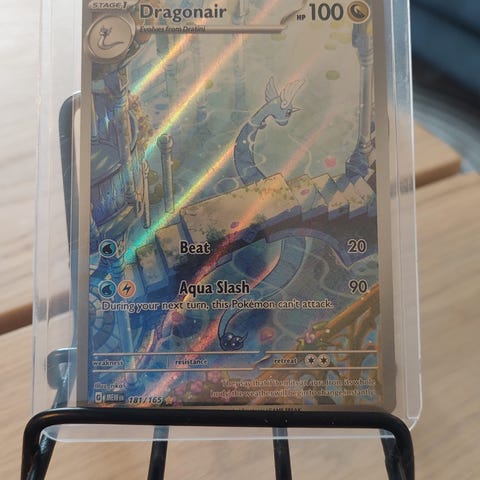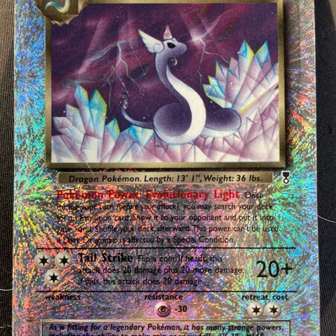 Dark Dragonair (38/110) kommer fra serien Legendary Collection og har en sjælden reverse holo effekt - også kaldet fyrværkeri (findes kun i denne serie). Kortet er i fantastisk stand og har næsten ingen slidspor. På nuværende tidspunkt er kortet jf. PriceCharting ca. 1000kr. Bud modtages gerne.