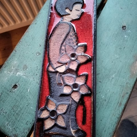 Relieffer er svagt buet og har et afslag i nederste venstre hjørne se foto.
