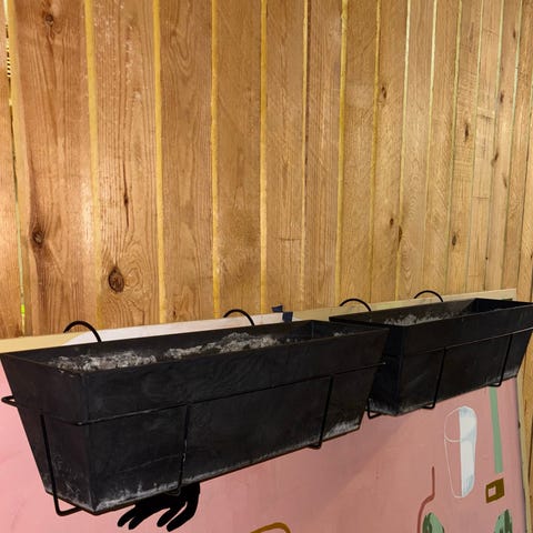 To altankasser fra Artstone inklusive ophæng. Kasserne er i mørk (genanvendt) plastik og har en marmoreret overflade. De er 55 cm lange, 17 cm høje og 16 cm brede/dybe. De er frostsikre.