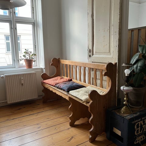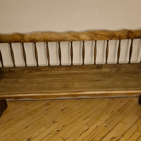 Egetræsbænk, aldrig rigtig brugt. Mål 70 lang, 37 bred og 45 høj