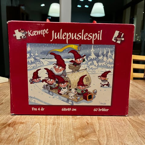 Jule puslespil med 1000 brikker. Motiv med juletema, der viser en julemand ved et juletræ omgivet af gaver og legetøj. Puslespillet er lavet af pap og har en høj detaljegrad. Fire puslespil for kr 40