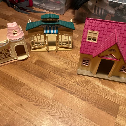 Sylvanian Families træhus legetøjssæt med flere små figurer og tilbehør. Indeholder to separate træhuse med detaljerede elementer som gyngestol, rutsjebane, hængekøjeog forskellige møbler. Sættet er designet til børn og fremstillet i plast og trælignende materiale med farver i naturtoner.
