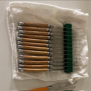 Set of new and unused steak knives (6) and forks (6).