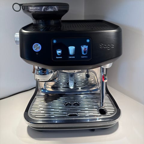 Breville Barista Max espressomaskine i rustfrit stål. Maskinen har en indbygget kaffekværn, dampstav til mælkeskumning og forskellige brygningsindstillinger. Designet til hjemmebrug med fokus på nem betjening og justerbar brygning.