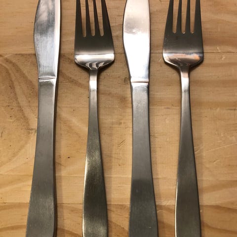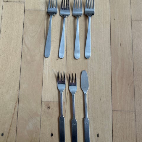 Der er 6 gafler, 6 knive og en enkelt teske. Måler hhv 17,5 - 17,7 -14,5 cm.