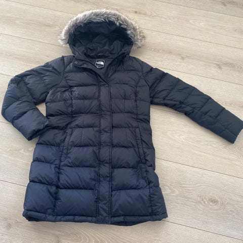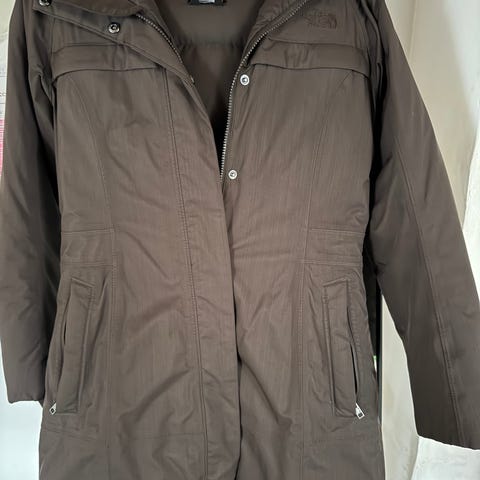 The North Face Vinterjakke i størrelse M til kvinder. Jakken er brun og lavet med dun som materiale, hvilket giver isolering og varme. Designet til vinterbrug med en længere pasform og hætte med pelskant.