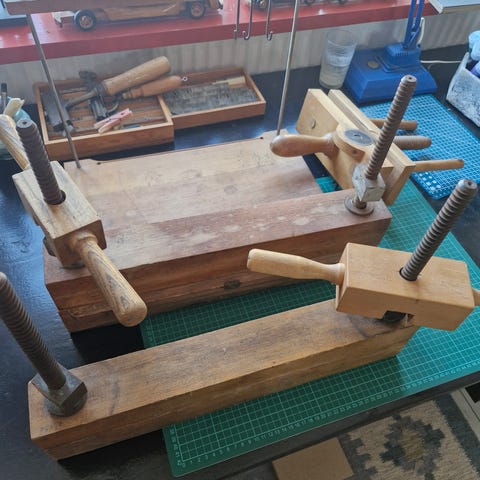 Diverse ting tihørende bogbinderfaget. Der er sylader, limgryde, og en masse andet jeg ikke nødvendigvis ved hvad er 🙂 jf billeder. (Fx også prægeplader til en bog af Gustav Wied).