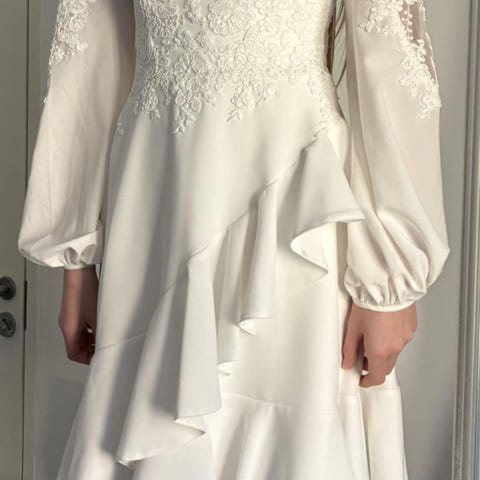 Kommer fra røg og parfume frit hjem. Kjolen er blevet renset lige efter brug. Den er brugt éen dag i august 2021 og fik ikke pletter på. Den har altid hængt og hænger stadig i plastfolie i mørkt skab og fremstår derfor stadig ret så fik og ny. Den er ikke tilrettet og er blevet oplyst at den kan lægges et nummer ud. Nypris 2685 kr.
