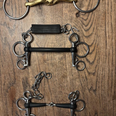 2 Neue Schule bid, begge str. 14 cm, god stand. Det ene bid er egnet til når hesten lægger sig hårdt på tøjlen, mens det andet bid er mere blidt og egnet til at få hesten til at suge frem på tøjlen. Pris kr 750 pr stk