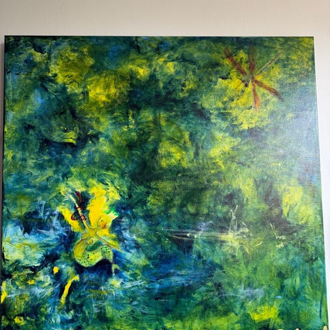 Jeannie Bolund Piger i en Kornmark maleri fra 1999. Størrelse 74 x 104 cm. Inkl. ramme. Maleriet viser to figurer i varme farver med en abstrakt stil. Værket er signeret og dateret på bagsiden.