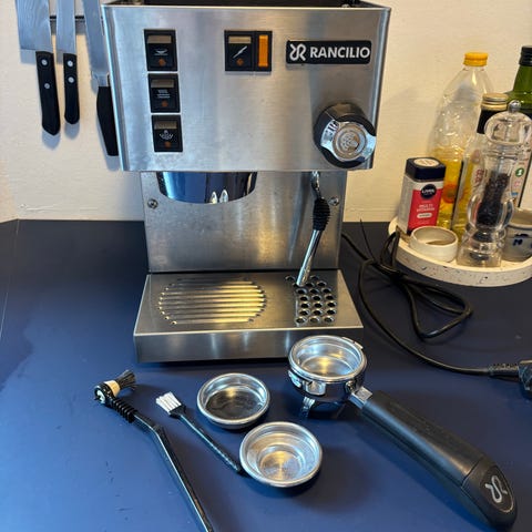 Practical 95E espressomaskine i rustfrit stål med dobbelt håndtag og trykmåler. Maskinen har en effekt på 2 kW med en spænding på 230 V