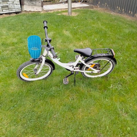 børnecykel med 18 tommer hjul, designet til børn. Cyklen har en hvid ramme med lilla og blå detaljer, herunder lilla skærme og styrgreb samt et sæde med blå og hvide farve pæn og velholdt. Ikke brugt meget