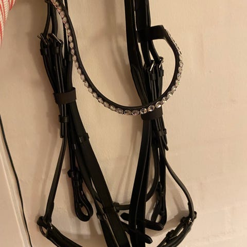 Ukendt trense i sort læder med metalbid og justerbare remme. Kun brugt få gange