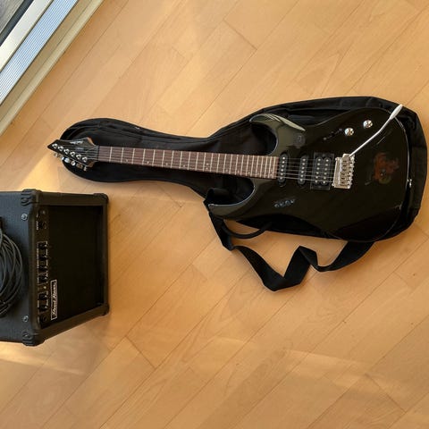 Dette er en Pearl River elektrisk guitar i en sunburst finish, vist med en M-15 forstærker.