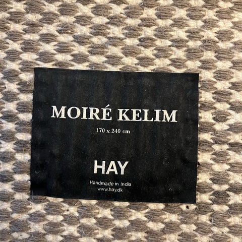 Hay Moire Kelim tæppe. Er 140 x 200 cm. Tæppet er i god stand. Sælges da jeg ikke skal bruge det længere.