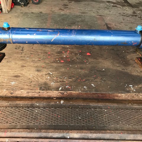 Hydraulisk cylinder måler 216 cm fra øje til øje, vandring ca 180 cm, 50 mm øjer og stempelstang måler 80 mm. Kunne eventuelt bruges til en kraftig kløver