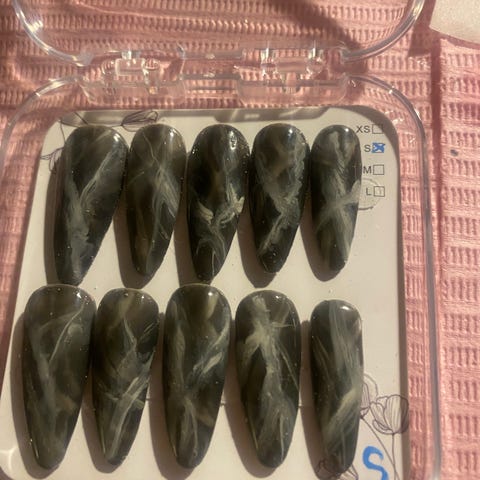 Neglene er håndlavet, de er størrelse S iforhold til det skema der ses på et af billederne det er muligt at få lavet personlige negle hvis størrelserne ikke passer.