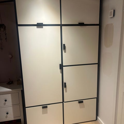 IKEA opbevaringsskab med flere rum i grå farve. Skabet har forskellige størrelser af opbevaringsrum, der kan bruges til organisering af diverse genstande.