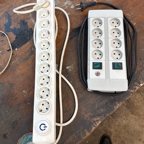 Stikdåse med 6 stik og afbryder. Hvid farve med ledning og stik til tilslutning.