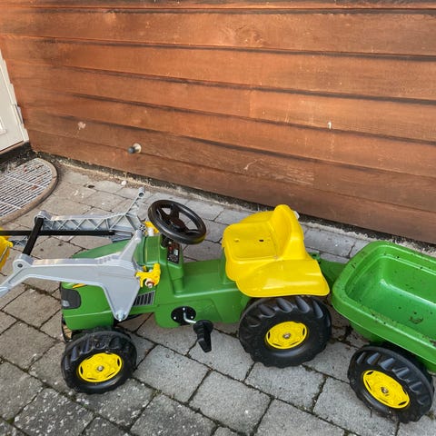 Børnetraktor hvor der kan kobles anhænger eller vandvogn på.