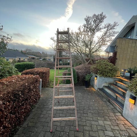 Træstige lavet af lyst træ. Stigen har flere trin og er velegnet til brug i hjemmet eller på arbejdspladsen til at nå højere områder.