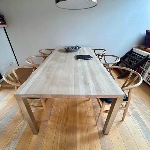 Spisebordet er smukt, men har en lang ridse (se billede). Det er ikke en dyb skade og kan udbedres med en slibning.