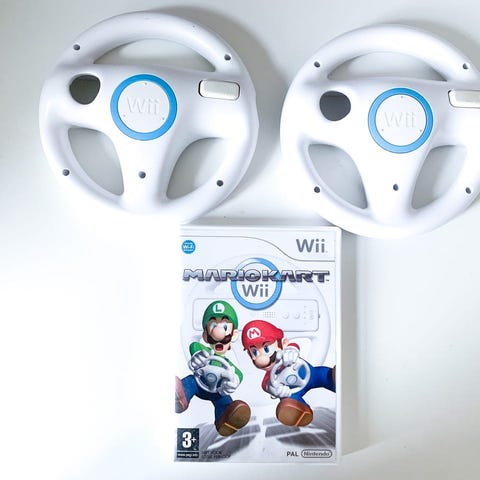 Nintendo Wii Mario Kart Wii spil med 4 hvide rat til Wii-konsollen. Rattene er designet til at give en realistisk køreoplevelse i spillet.