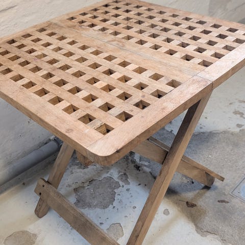 Flot og praktisk foldbart bord i mørkt bejdset træ med dekorativt gittermønster i bordpladen.